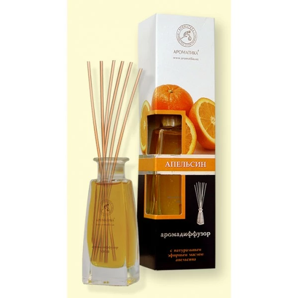 - Состав: ароматическая композиция «Апельсин», натуральное эфирное масло апельсиновое, комплект тростниковых палочек для испарения аромакомпозиции