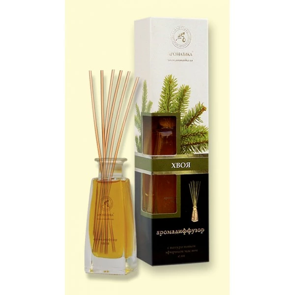 - Состав: ароматическая композиция «Хвоя», натуральное эфирное масло еловое, комплект тростниковых палочек для испарения аромакомпозиции.