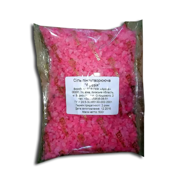 - Состав: соль морская натуральная, ПАВ, краситель, отдушка, экстракт фрезии.