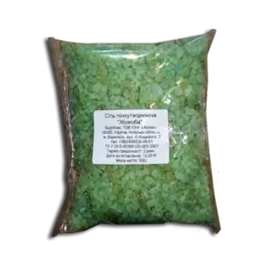 - Состав: соль морская натуральная, ПАВ, краситель, отдушка, экстракт жожобы.