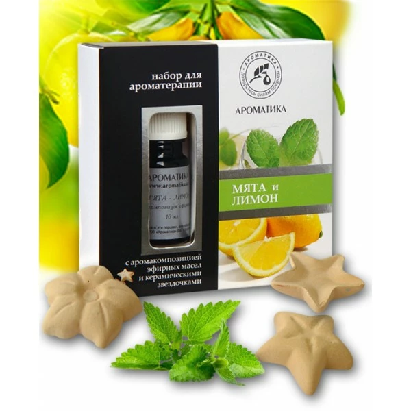 - Состав: аромакомпозиция 100% натуральных эфирных масел «Мята-Лимон» (10 мл) – 1 шт.; керамические звездочки – 5 шт.