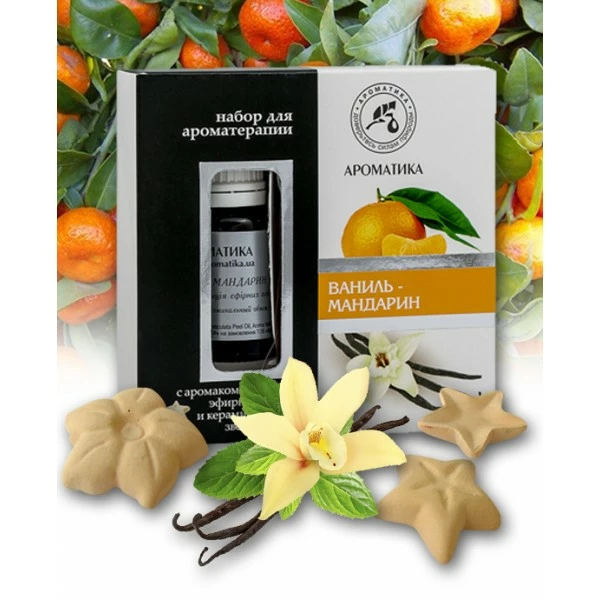 - Состав: аромакомпозиция эфирных масел "Ваниль-Мандарин" 10 мл - 1 шт.; керамические звёздочки - 5; алюминиевая баночка - 1 шт.